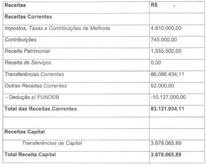 Art. 2° A receita será realizada mediante a arrecadação dos tributos, transferências constitucionais e outras fontes de renda, na forma da legislação em vigor e de acordo com o seguinte desdobramento: